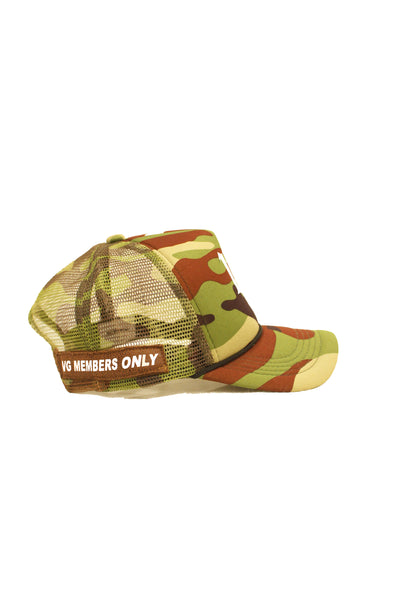 Camouflage VG Trucker hat with patch on side profile. Adjustable snap backing